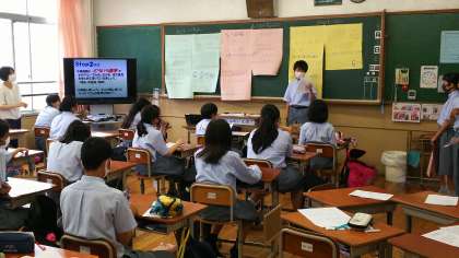 班ごとに,班でまとめた意見を発表しています。