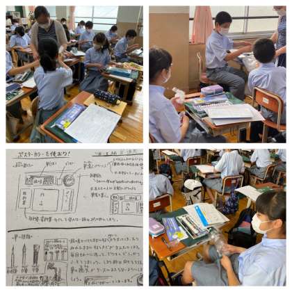 4組は美術。教室で行っています。新しいポ゜スターカラーの確認をしています。筆にもいろいろな種類があります。それを上手に使い分けてこれからさまざまな作品を創作していきましょう。