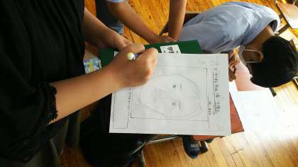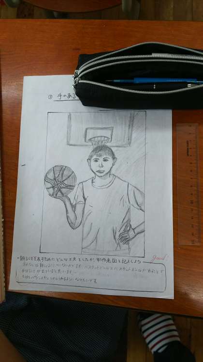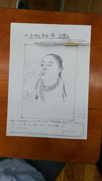 3年4組美術の授業です。自画像をポスターカラーで仕上げる前の下絵の段階です。完成は9月の予定ですが,試行錯誤をしながら先生にも手伝ってもらい下絵を完成させていきます。作品には必ず【手】を描写することになっているそうです。完成が待ち遠しいです。