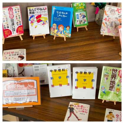 1年生の図書コーナーには、定期テスト前ということもあり、テスト勉強に役立つ本が置いてあります。