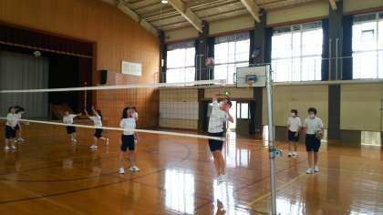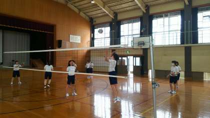 3年3組の体育です。スパイクの練習風景です汗びしょびしょになって頑張っています。バレーボールの技能の中でも,スパイクが一番難しい技術と思います。