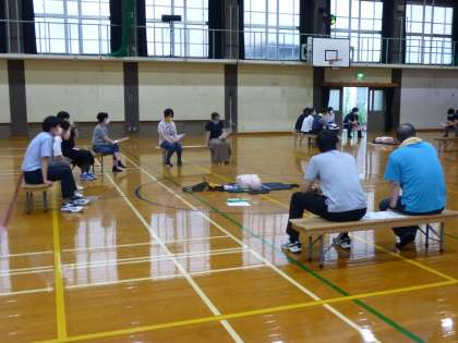 本日午後から,教職員研修として,安全講習会(救命救急)を体育館(3密を避け)で行いました。学校教育活動を安心・安全に行うために,1心肺蘇生法 2エピペンの使用について 3水難事故や熱中症について・・という3本柱で,講習を行ないました。保健体育科・保健室の先生を中心に,学年ごとに分かれて心肺蘇生法の手順等を一つずつ確認していきました。毎年行っているとはいえ,忘れていることもあり,先生方もみんな緊張感を持って研修に取り組んでいました。