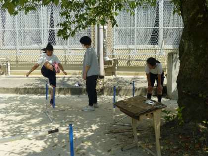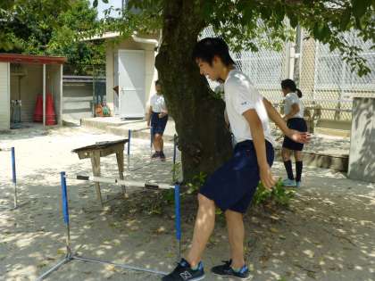 体育の時間で,ハードルを使ってのトレーニングです。
