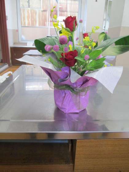 今日は、文化部女子チーム月いちの華道のお稽古日でした。今日は、敬老の日のプレゼント(例年は、5月頃に「母の日」に寄せて)ということで、フラワーアレンジメントをしました。