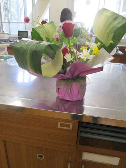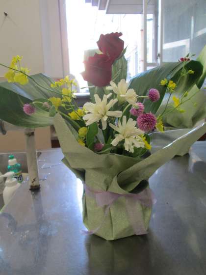 でも、生け終わってラッピングもして、可愛らしく仕上がりました。プレゼントに、手作りのフラワーアレンジメントということで、こんなふうに花をもらえると、きっと嬉しいでしょうね。