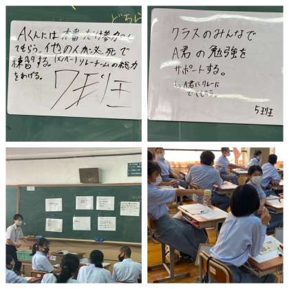 ●A君はA君なりに、クラスはクラスなりに意見があって少しズレているところもあるからお互い話を聞いて解決したらいいと思いました。もしA君が出るとなったら、どう勉強するかも話したらいいと思います。たぶんこれから似たような場面に出会うと思うので生かそうと思いました。