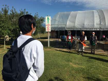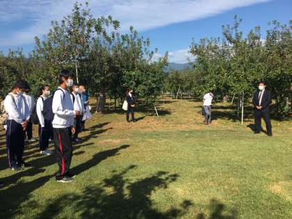 現地のリンゴ園に到着しました。皆さん知っていましたか?多くの県には○○ロードというように,飯田市にもアップルロードがあります。その飯田市の街路地には,216本のリンゴの木が並んでいます。もちろん,実もなっているんですよ。採って食べる人はいませんけどね。