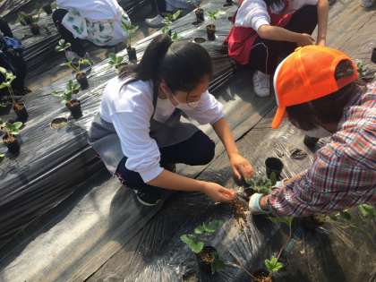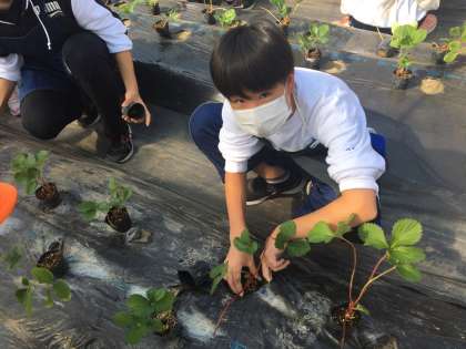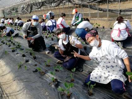 今からイチゴのを植えます。ビニールハウスに2列でスタンバイしています。4月から大切に育てた苗を本日、植えます。インストラクターの指示に従い正確に植えることが求められます!黒のポットを上手に外すことができたでしょうか!?コロナ対策のため背中合わせで作業します。丁寧にね。昨年のチャレンジ体験でお世話になった樋口農園での体験が活きています。
