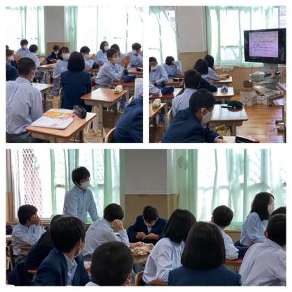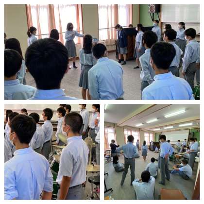 各クラス,工夫を凝らして練習に励んでいます。2年2組は半分に分かれての練習ですが,本番の並び順でジグザグに分かれています。隣から仲間の歌声が聴こえない状態でしっかり音を取れているか,声量が出ているかが課題です。2年3組は教室で,各パートリーダーから現状とこれからの課題が報告されています。テレビ画面には先生からの応援メッセージが・・・。合唱コンクールまであと10日です。本番が楽しみですね!みんなガンバレ!!