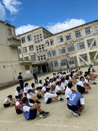 気持ちの良いお天気の下,体育の部の練習を行いました。今日は2回目でした。実際の応援席から入場→準備体操[ラジオ体操]の流れを確認しました。ラジオ体操は,しっかりやると結構暑くなりますね。全校生徒で行いますので,きびきびと体操しましょう。揃っていると,とてもきれいですよ!あとは各種目の召集と入場・スタートからゴールまでのコースの確認を行いました。さすが2年目だけあってスムーズに取り組めましたね。最後は,クラス対抗の大縄跳びです。縄を回す人も跳ぶ人もたくさん汗をかきながら頑張っていました!体力だけでなく集中力と団結力が必要ですね。みんなガンバレ!!!