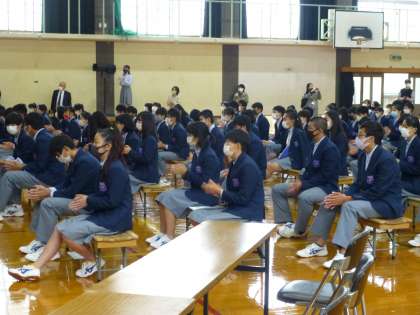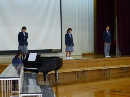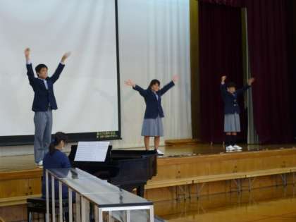 1組の発表では,聴いている生徒から自然と手拍子が湧きおこりました。リズミカルな曲に合わせて踊ったりしながら,たのしく歌い上げてくれました!しっかり発表できましたね。最後は大きな拍手に包まれました!
