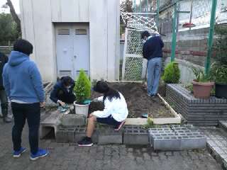 1組は、農作業で地域の方から頂いた木(ゴールドクレスト?)を植えました。