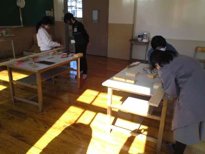 1組の3限目は、生活の授業で「簀子作り」をしました。写真は、材料に紙やすりをかけている様子です。