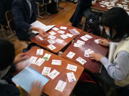 1年4組は、国語の授業で「故事成語のカルタ」でカルタ取りをしました。読み札が故事成語の意味で、取り札が故事成語となります。