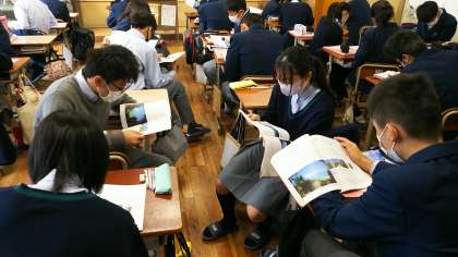 2年2組の英語です。グループで教科書の物語を分担して,それぞれの個所を朗読している様子です。