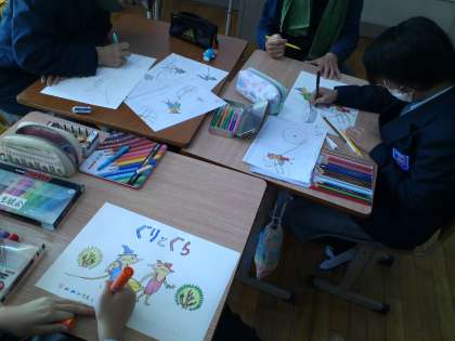 1組は、国語の授業で、双子の野ねずみ「ぐり」と「ぐら」を主人公とする物語の紙芝居づくりをしました。担当を線画と彩色に分業して作っています。出来上がりが楽しみです。