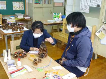 生活の時間です。廊下に掲示する1月のスケジュール表のデザインを考えたり,クリスマスツリー&リース飾りを作っていました!