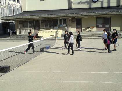 テニス部は、素振り練習です。膝を曲げ,腰を落とし,左手(右利きフォア)でボールを捉えるイメージを持ちます。腰を回転させながらラケットを振り抜き,手首を返して,腕を首に巻きつくようにフォローします。これを何度も練習しましょう。