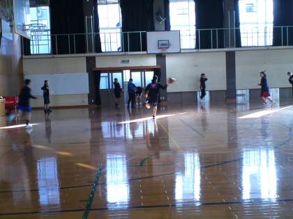 女子バスケットボール部は、ランニングパスからのシュート練習です。試合中は必ずディフェンスがいるわけですから,ダッシュで低く早くボールを見ないでドリブルを行い,パスは早く正確に,味方がもらいたい場所に出す。できれば味方を見ないで出す。