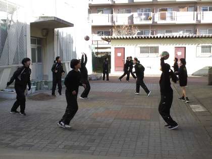 バレーボール部は、パスの練習です。野球でいうとキャッチボールです。バレーボールの中で一番時間をかけなければならない練習です。パスですから,チャンスボールが飛んできたら,セッターに100%正確に返球しなくてはなりません。