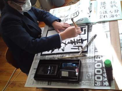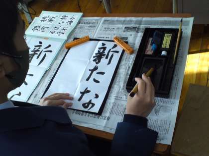 1組は、国語の授業で書初めの練習をしました。