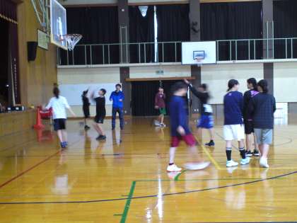 女子バスケットボール部は、シャドーシュートの練習です。ボールを使わず、シュートの動きをシャドーで行い、自分のひざやスタンスの広さ、ひじの角度、手のひらの感覚、左手の添えかた、ボールをリリースする位置など、角度を変えながらいろいろ試していました。