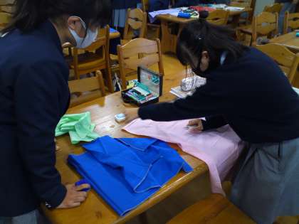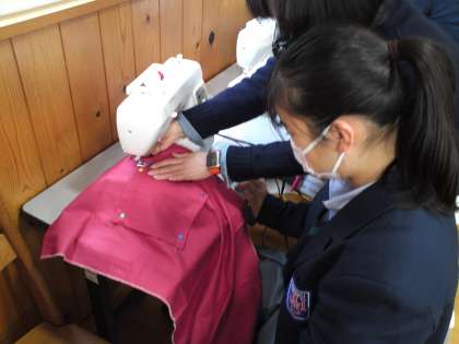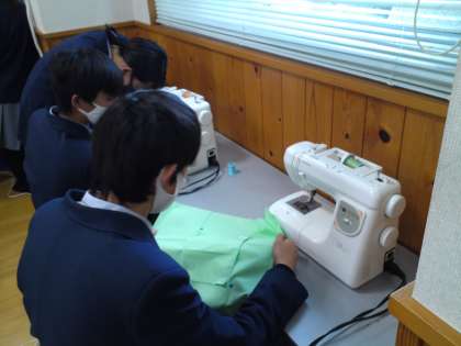 1年2組は、家庭科の授業で「エコバッグ作り」をしました。思い思いの色の生地を選んで作っています。中にはミシン縫いに手こずる生徒も見られました。