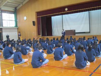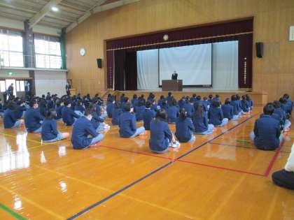 その後、生徒指導部長の先生、生活安全委員長の年頭のあいさつがありました。それぞれに、この3か月間、次の学年・次のステージへの大切な時である、ということを話して下さいました。「充実した1年間だった」と思えるように、毎日を大切にしながら過ごしていきましょう。