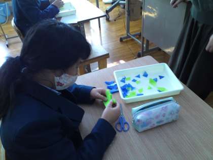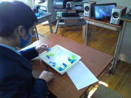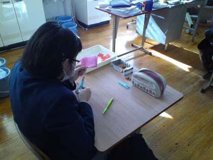 1組は、美術の授業で「明かり」づくりのための素材づくりをしました。