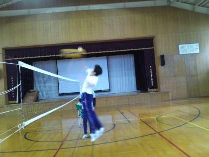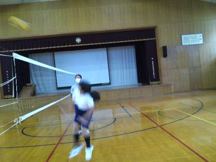 1組は、体育の授業でバレーボールのスパイクの練習をしました。その後、1年生チーム(男性教師2名参加)対3年生チーム(女性教師1名参加)の3人対3人でのミニゲームをしたところ、3年生チームが見事に勝ちました。