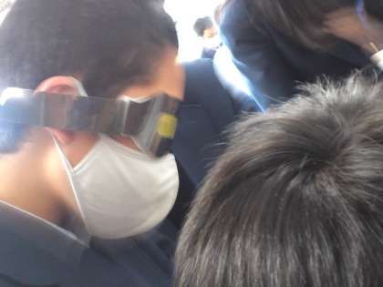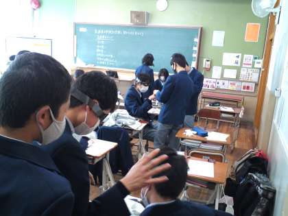 2年2組は、技術家庭の授業で「高齢者の特徴を理解し関わり方を考えよう」というテーマで、白内障を体験できるゴーグルを使って高齢者がどのように見えるのかを実感することにより高齢者について理解を深めました。