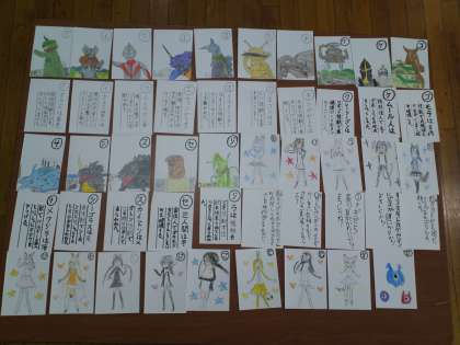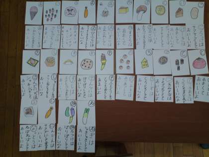 1組は、生活の授業で、「カルタ作り」をしました。1年生女子は「ケモノフレンズ」、3年生男子は「ウルトラマンシリーズ」、そして3年生女子は「食べ物」をテーマに作っています。これまでに完成した分を紹介します。