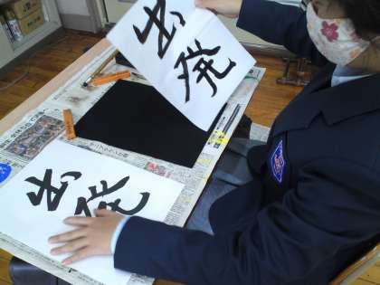 1組は、国語の授業で1年生は「出発」、3年生は「永遠」の書写をそれぞれ行いました。これを清書し、前回紹介した「小さな巨匠展」に出品します。