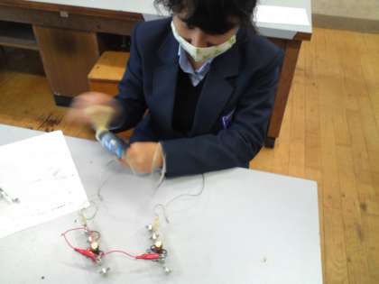 1組は、理科の授業で「手回し発電機を使って発電しよう」というテーマで、豆電球を繋いだ回路を使って手回し発電機で発電される様子を観察しました。