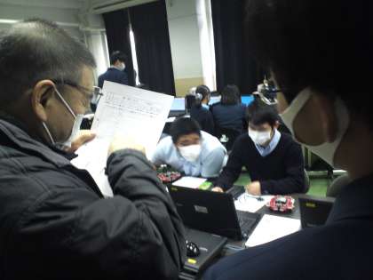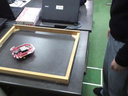 3年2組は、技術の授業で「ロボットカーのプログラミング」について学びました。目的とするプログラミングの内容は、壁に当たると向きを変えて進み、丸い白紙(明るいところ)で止まるというものです。