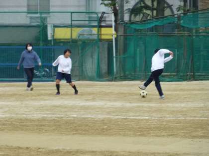 先生も交えて,みんなでパス回しをしました。パスを回しながら,一人がボールをカットしにいきます。上手くパスが繋がったり,また空振りしたり・・。いっぱい動き回りました。