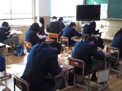 3年4組は、理科の授業で入試本番を見据え、他県の公立高校の入試問題を解いたり、担当教師から個別に入試対策アドバイスを受けたりしました。