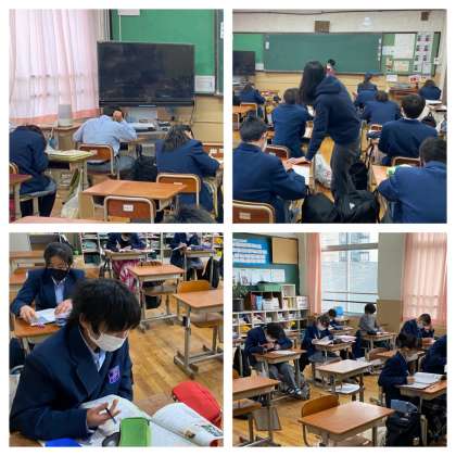 一教室で行うつもりでしたが、一つの教室だけでは、入りきらないでの、2組と4組の教室に分かれて取り組みました。