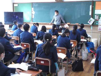 1年3組は、家庭科の授業で「中学生の時期に必要な栄養の特徴を考えることができる」というテーマで、中学生の時期は活動量が多いことに加え、身体が大きく成長する時期であることから、バランスの良い食事を心がけることが必要であり、特にビタミンB1・B2、カルシウム、鉄分、たんぱく質やエネルギーを多く生み出すものを成人より多く摂ることが必要であるということを学びました。