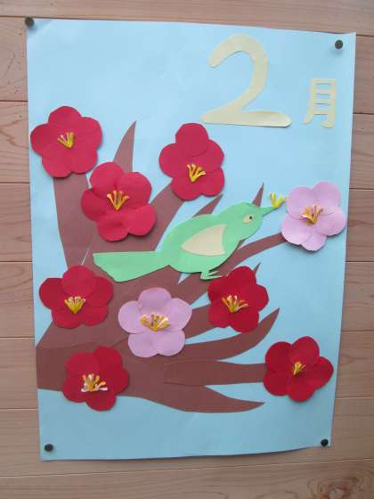2月らしく、うぐいすを貼り絵にしました。梅にうぐいすです。ここのところ寒暖差が激しく、なかなかうぐいすの声を聞ける日がありませんが、少しでも通りがかりに春らしい雰囲気を味わっていただけたら…と思います。
