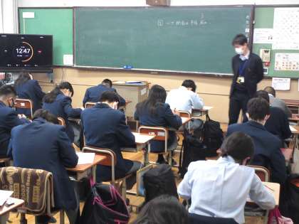 1年2組は、数学の授業で定期テストの内容を一部変えて再テストを受けました。特にみんなが苦手としていた図形を切り取った場合の表面積や体積の計算が重点でした。