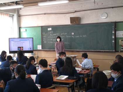 1年2組は、英語の授業で「“一年間の思い出”という英文の理解」に努めました。