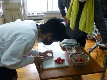 これまでに収穫した野菜等をすべて使って,たこ焼きづくりです。3年生の二人にとっては,中学校生活最後の調理実習となります。自分たちで大切に育てた野菜を,自分たちの手で調理し,自分でありがたく味わうのはもちろんのこと,多くの人にふるまい,「おいしいね!ありがとう!」と言ってもらい,本当に充実した時間となりましたね!成長した3年生の姿がとても印象的でした!