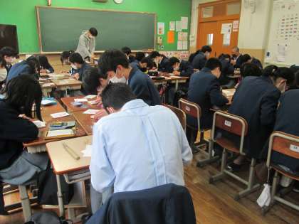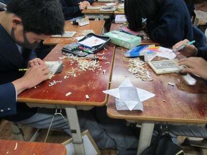 生徒の皆さんが取り組むのは,やや単純化された絵でしたが,掘っている手元がなかなか危なっかしかったです。聞けば,小学校6年生以来の版画だとか…。完成までに,勢い余って手まで掘りませんように…と,祈る思いで写真を撮りました。