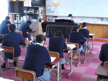 2年2組は、音楽の授業で「テスト返しと解説」に続き、合唱曲「いのちの歌」の歌唱練習をしました。テストについては、歌舞伎”勧進帳”に関する問題の正解率が低かったようで、特に丁寧に解説がなされました。