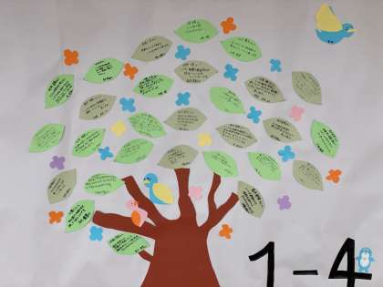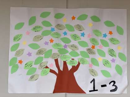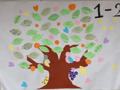 ひとりひとりが互いの素敵なところを描いたリーフを集め、各クラス素敵な1本の木にしてくれました。