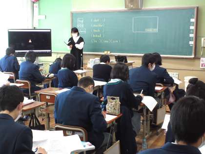 2年2組は、英語の授業で“ONE OK ROCK”というグループが東日本大震災の追悼曲として作曲した”Be the Light”という曲の聞き取りを行った後、以前に作成した“My Favorite”という題の英作文の展示作品づくりをしました。
