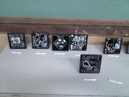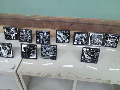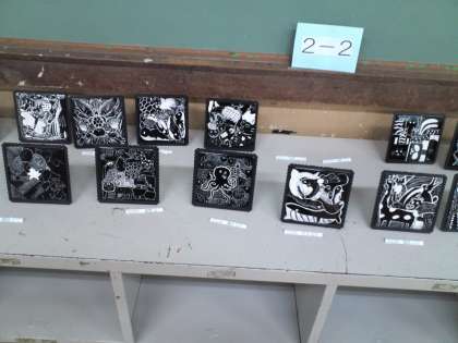 2年生の美術の課題「スクラッチタイル」の作品群(その1)