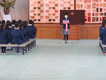 その後、生徒会代表者による歓迎の言葉として、一人ひとりがライオンハートを見つけ充実した三年間の学校生活を送ってほしいとの激励に続き、新入生代表者から、お互いを支え合って、よりよいクラスを築いていき、嘉楽中学校で過ごす三年間を終えたときに悔いが残らないよう一つ一つの時間を大切に過ごしていきたいとの希望に満ちた誓いの言葉がありました。