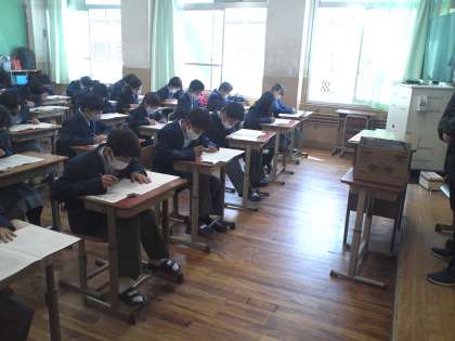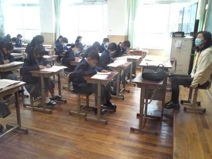 1限目は、小学校の学習確認としてジョイントプログラムというテストを受けました。科目は国語です。みんな、真剣な表情をしていますね。